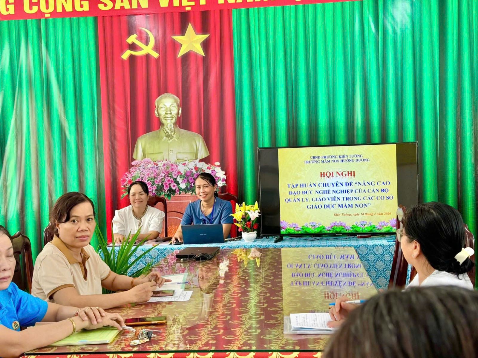 Ngày 18/4/2026, Trường Mầm non Hướng Dương đã triển khai Hội nghị tập huấn chuyên đề “Nâng cao đạo đức nghề nghiệp của cán bộ quản lý, giáo viên trong cơ sở giáo dục mầm non”. Qua chương trình tập huấn, đội ngũ cán bộ quản lý và giáo viên được bồi dưỡng, nâng cao nhận thức về đạo đức nghề nghiệp, lối sống, phong cách sư phạm, đồng thời tăng cường ý thức và tinh thần trách nhiệm trong công tác nuôi dưỡng, chăm sóc và giáo dục trẻ. Đây là hoạt động ý nghĩa, góp phần xây dựng môi trường giáo dục an toàn, thân thiện và chuyên nghiệp.🌱📚